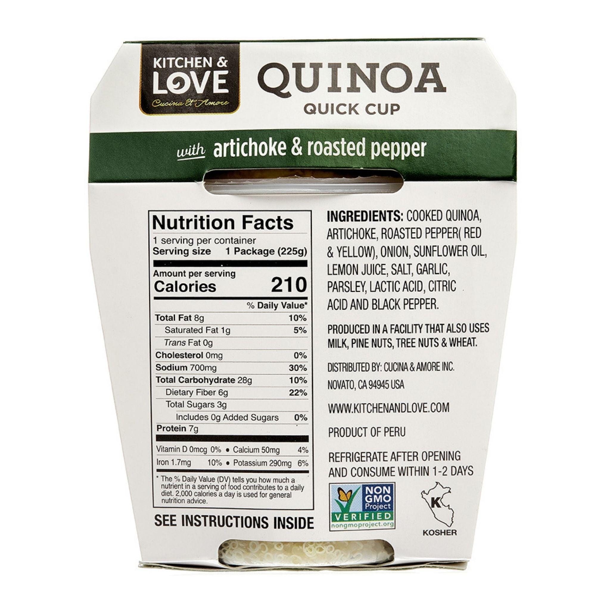 ARTICHOKE & ROASTED PEPPER QUINOA CUP INGREDIENTS: Cooked quinoa, artichoke, roasted pepper (red & yellow), onion, sunflower oil, lemon juice, salt, garlic, parsley, lactic acid, citric acid and black pepper.