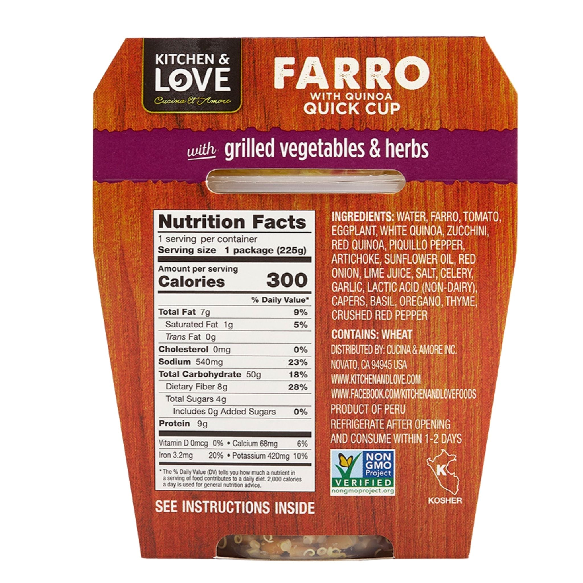 GRILLED VEGETABLES & HERBS FARRO CUP INGREDIENTS: Cooked farro, tomato, eggplant, cooked white quinoa, zucchini, cooked red quinoa, piquillo pepper, artichoke, water, sunflower oil, red onion, lime juice, salt, celery, garlic, lactic acid, capers, basil, oregano, thyme and crushed red pepper. CONTAINS: Wheat