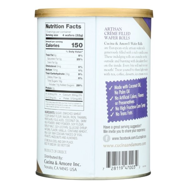 Cucina & Amore Wafer Rolls are European-style artisan wafer rolls generously filled with a rich and flavorful cream. These indulging rolls are crunchy on the outside and bursting with decadent flavor on the inside. Every bite will melt in your mouth. These light wafers go well with tea, coffee, desserts, ice cream or as is.